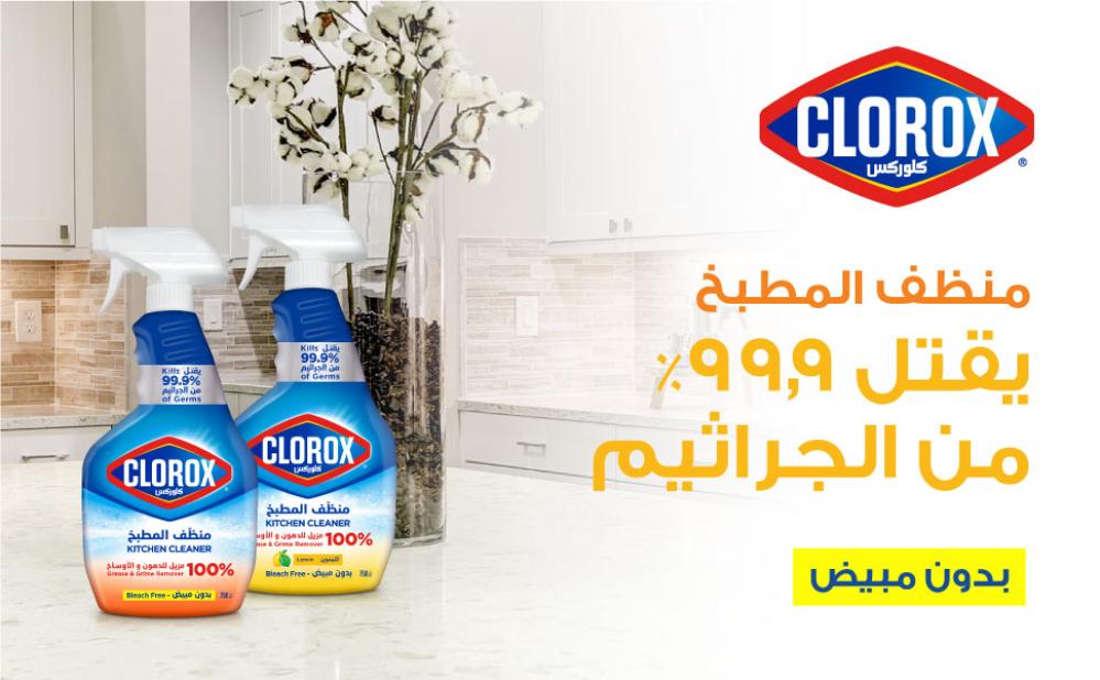 قومي بالتنظيف والتطهير باستخدام منظف المطبخ القوي من كلوركس والذي يقتل 99.9% من الجراثيم الموجودة في مطبخك. 100%مزيل الدهون والأوساخ فقط امسحي الدهون والأوساخ الموجودة حول مطبخك بإستخدام منظف المطبخ من كلوركس الذي يخترق بقع الطعام الصعبة ويزيلها بشكل فعال من الأسطح. احصلي على مطبخ نظيف باستخدام منظف المطبخ من كلوركس: أواني الطبخ، والأسطح، والأفران، وأسطح المواقد، والأغطية، والثلاجات، والخزائن، والمغاسل، والأبواب، والممرات، والنوافذ والأرضيات. يسمح البخاخ برش المنتج على الأسطح بشكل متساوي ما يسمح بتوزيع المنتج بسهولة، يُعد منظف المطبخ من كلوركس الخيار الأمثل للمطابخ المزدحمة حيث أنه سهل الإستخدام. منظف المطبخ من كلوركس الخاص بنا هو بديل تنظيف متكامل بدون مبيض للمطابخ بنفس فعالية كلوركس. عندما يتعلق الأمر بالحماية، ثقي بكلوركس.