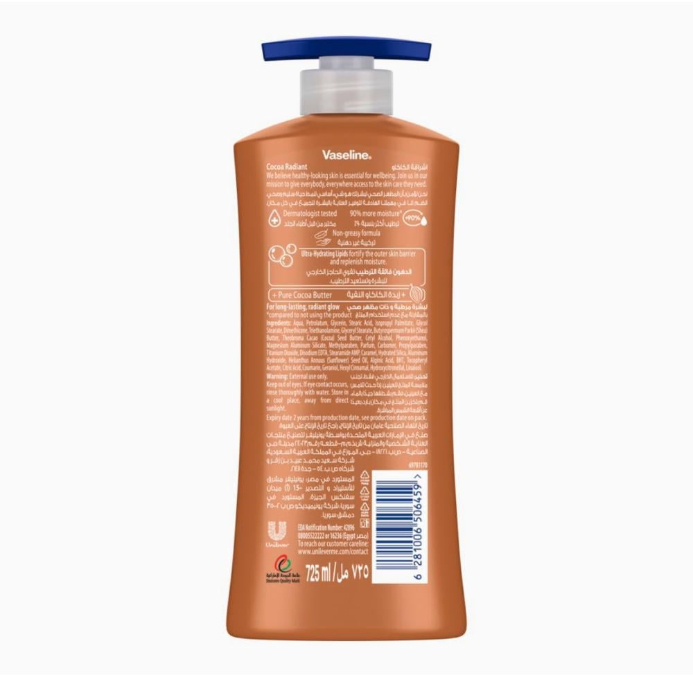 • يحتوي لوشن الجسم الغني بـزـــبدة الكاكاو من فازلين على الكاكاو النقي بنسبة 100% وزـــبدة الشيا المعروفة والتي تشتهر بفعاليتها في تحسين إشراق البشرة ولمعانها الطبيعي