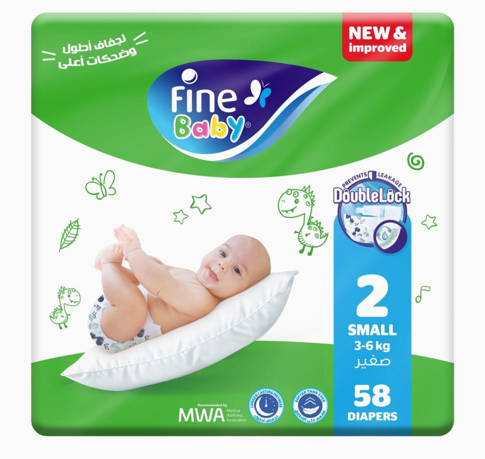 فاين بيبي حفاضات مقاس 2 بحجم صغير 3-6 كغ 58 حفاض بتقنية دوبل لوك بحواجز مزدوجة لمنع التسرب