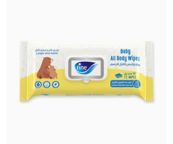 فاين مناديل مبللة لكامل الجسم من فاين بيبي تمنحك حلاً سهلاً وفعالًا للحفاظ على نظافة طفلك في كل الأوقات. حجمها الأكبر يتيح تنظيف الجسم بالكامل بمسحة واحدة فقط دون عناء. عملية وسريعة لتمنحك راحة البال في المنزل أو أثناء التنقل.
